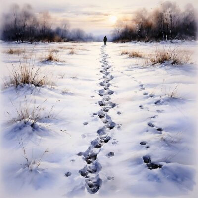 Зимний пейзаж и размышления певца о следах, оставленных на снегу. Наблюдая за цепочкой следов, оставленных неизвестным пешеходом, и задаётся вопросом о том, куда и зачем спешил этот человек. Следы на снегу становятся символом судьбы, которая, подобно цепочке шагов, предопределена и не поддаётся объяснению. Снег, оставаясь безмолвным свидетелем, хранит тайну, не раскрывая её. Присутствует мотив раздумья о жизни, судьбе и непредсказуемости человеческого пути.