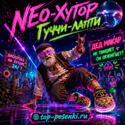 Ироничный гимн деревенской дискотеке. Рассказчик «залетает на диско в хромированных лаптах», у него в канистрах премиум мазут. Дядь Макар за пультом в ушанке с трацами, балалайка жарит как стратокастер. Гармонь поёт, колонки рвут, весь хутор в неоне танцует. Это не уль-деревня, а свой движ. Короткие юбки, неон на плетнях, бит жарится на сельских полях. Тюнинг — телега на диско, в погребе свежий бит, сельсовет в шоке, сорняки завяли. Трактор — ламбо, а кто не с ними — тот «невидимеш». Лужи светятся как стразы, куры несут яйца-алмазы, связь через астрал вместо интернета, в коровнике собирался рейв. Городские пляжи бросятся в гости, но контроль — на гусином пастбище. Врубай на полную, вся страна должна слышать: Неохутор — это сила и глубина. Припев повторяется.